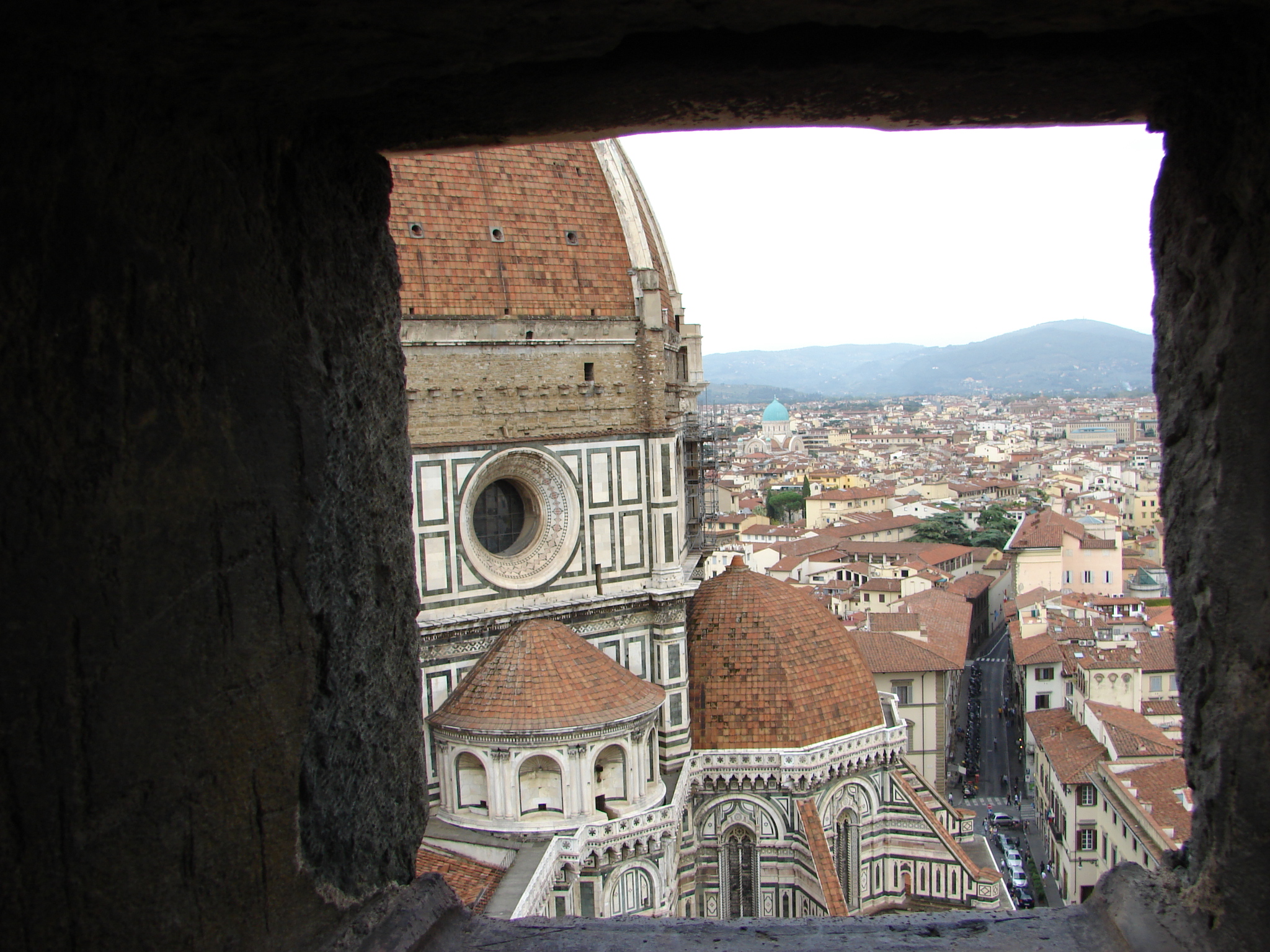 We decided to hit the area around the Duomo – as big, colorful, and wonderful as I remembered it, but now with a small iron fence around it. We didn’t go inside because of the line, but I dared Shelly to walk to the top of Giotto’s Tower. It’s open only a few days of the week for only a few months of the year. You know, it’s one of those places where they have warnings in several different languages not to attempt if you have medical problems. She accepted my dare, and six euro and 414 steps later we made it to the top and some of the most breathtaking views in the world. We took way too many pictures and playfully picked out the places we decided we could live. Shelly wanted a rooftop garden, so that helped narrow things down.