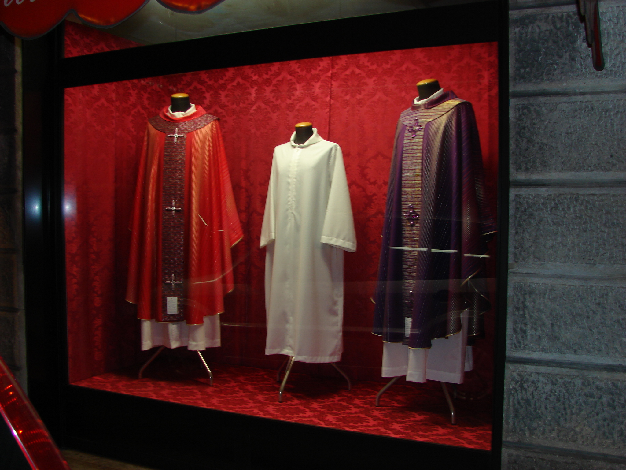 We decided to break our dinner habit of eating downstairs and ventured off a few blocks from our apartment, down by the river. Via Interrato dell Acqua Morta (dead water) is basically where the river used to be, and is now covered over by streets and houses. We walked right past a church frock store. One couple stopped to look and they crossed themselves. We just took pictures.