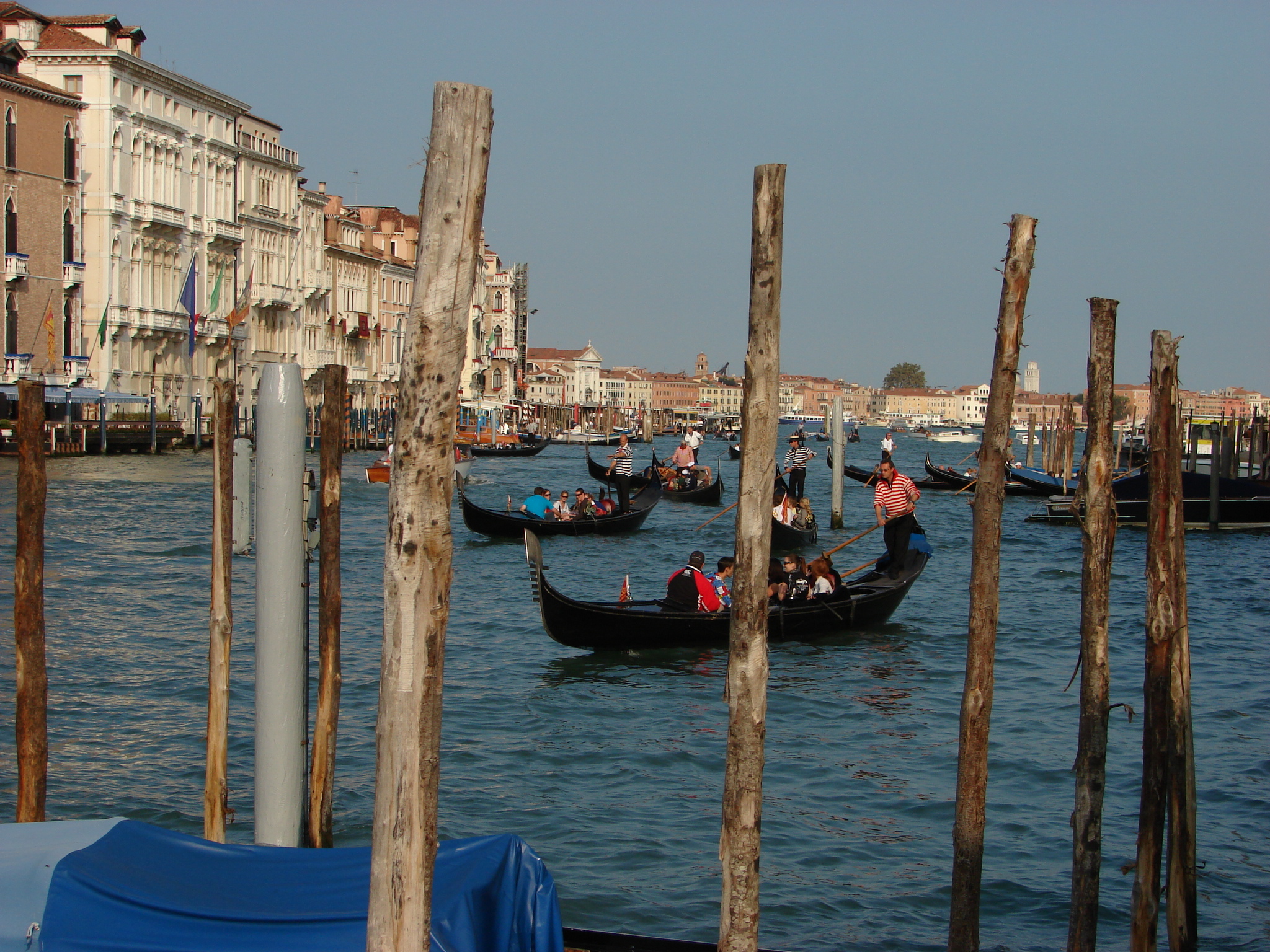 Venice. The train station exited right onto the Grand Canal where we jumped on a water taxi. The weather had cleared and warmed up, so it turned out to be a perfect day. We passed gondoliers, work boats, all kinds of boats. I can now say that I have seen someone steering a boat and talking on a cell phone at the same time.